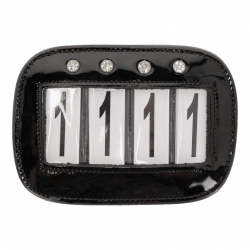 Cet élégant porte-numéro en cuir verni est orné de quatre strass, ce qui lui confère une allure élégante. Il convient aux inspections et aux concours, y compris à l'étranger, grâce à ses quatre chiffres. Le porte-numéro est livré avec des numéros interchangeables et se fixe facilement à un bridon ou à un tapis de selle à l'aide de bandes velcro ou d'une épingle à nourrice.
