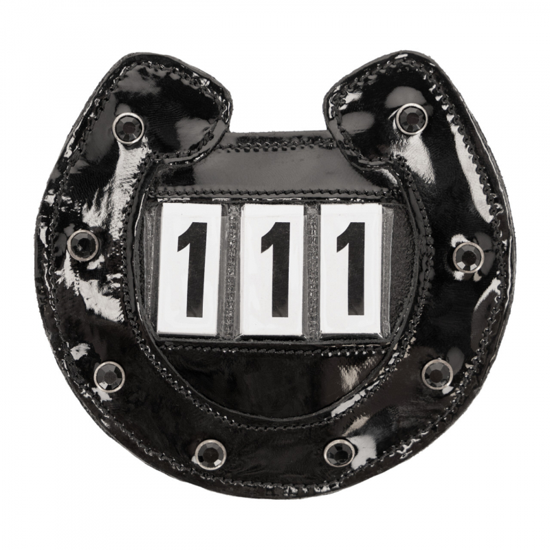 Le porte-numéro en forme de fer à cheval est fabriqué en cuir verni et en strass. Ce porte-numéro peut être facilement fixé à la bride ou au tapis de selle à l'aide d'épingles à nourrice ou d'une bande velcro. Les numéros interchangeables sont inclus.