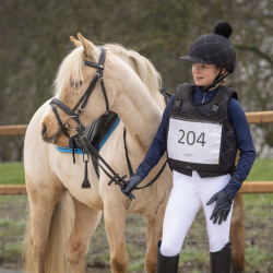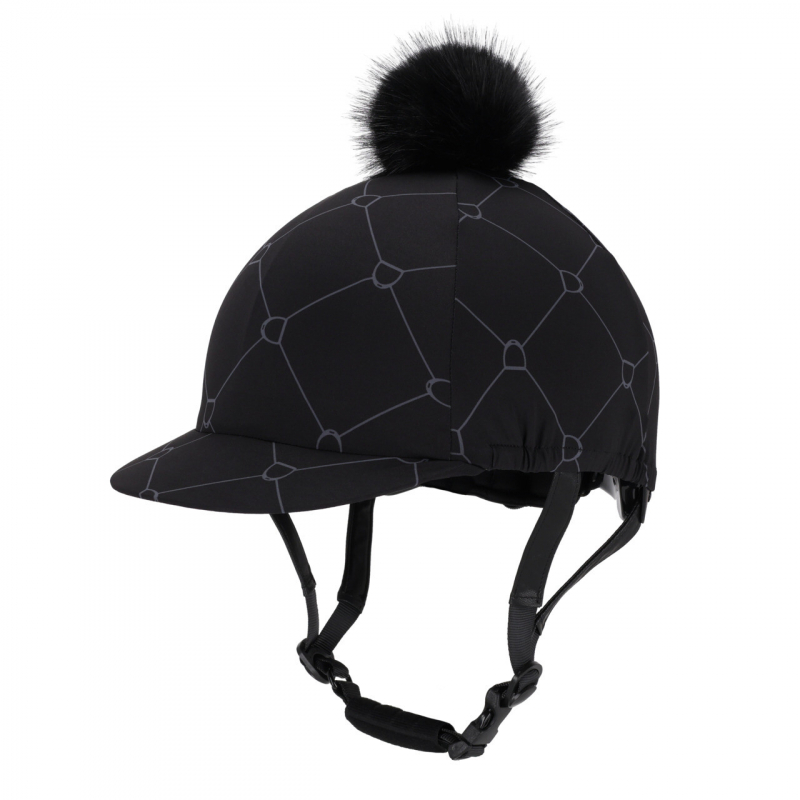 Ce couvre-casque avec impression d'étrier et pompon  est doté d'une visière qui protège du soleil et des branches basses lors des randonnées à cheval. La visière ne gêne pas en cas de chute.