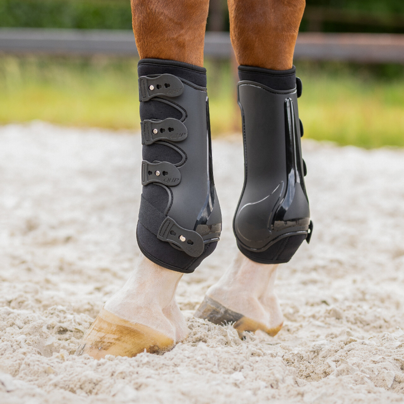 Protégez les tendons de votre cheval contre les coups avec ces guêtres. La doublure en néoprène à circulation d'air spéciale assure une bonne dissipation de la chaleur et de l'humidité. Les orifices d'aération situés dans la coque à proximité des tendons permettent d'éviter la surchauffe des jambes. Les guêtres s'attachent facilement grâce à des fermetures rapides élastiques. Convient pour l'entraînement, les concours ou les cérémonies de remise de prix, à la place des bandages.