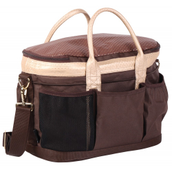 Sac de pansage pratique avec suffisamment d'espace pour les brosses et, par exemple, un casque. Le sac est doté d'un couvercle avec une double fermeture éclair et d'une bandoulière amovible et réglable. Des poignées robustes et diverses poches latérales complètent le sac.
