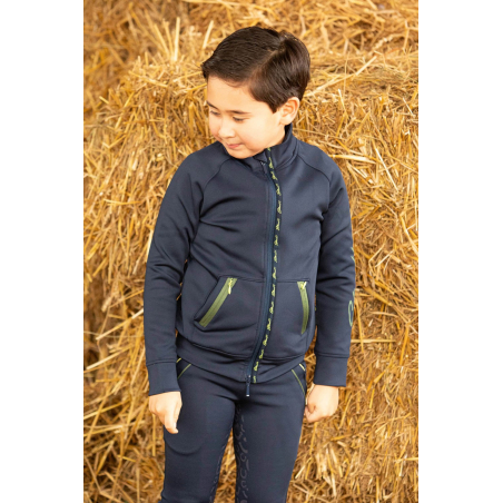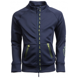 Veste avec fermeture éclair double sens et bande décorative le long de la fermeture portant le logo STOUT!, deux poches zippées avec passepoil contrastant, et logo STOUT! sur la manche et dans le dos.